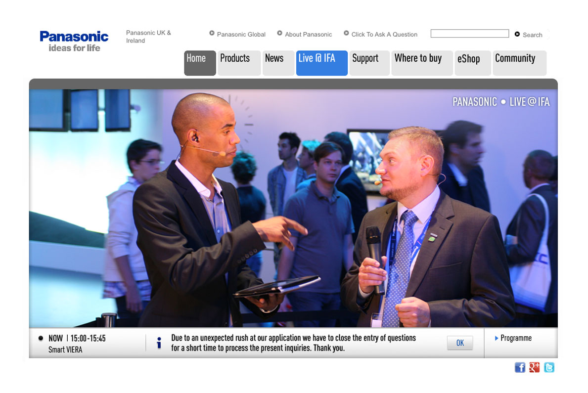 Mehrere Jahre hat Scholz & Volkmer den Kunden Panasonic betreut. Damals entstanden Webspecials fĂ¼r verschiedenste Produkte mit dem Schwerpunkt auf LUMIX Kameras und VIERA TVs. Besonders spannend war das Projekt Panasonic Live@IFA, das ich im 2. Jahr betreuen durfte und auch eine Woche vor Ort Teil der Crew sein konnte.